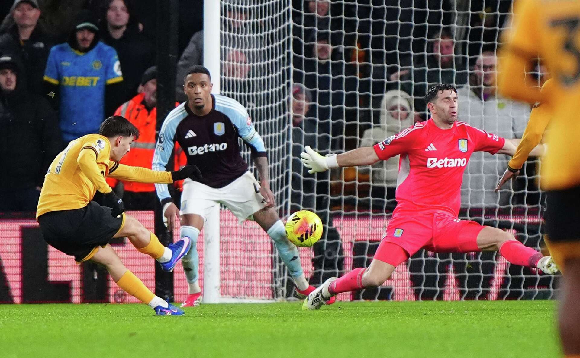 João Gomes fires home the opener for Wolves, beating Emiliano Martínez with a powerful shot into the top corner.