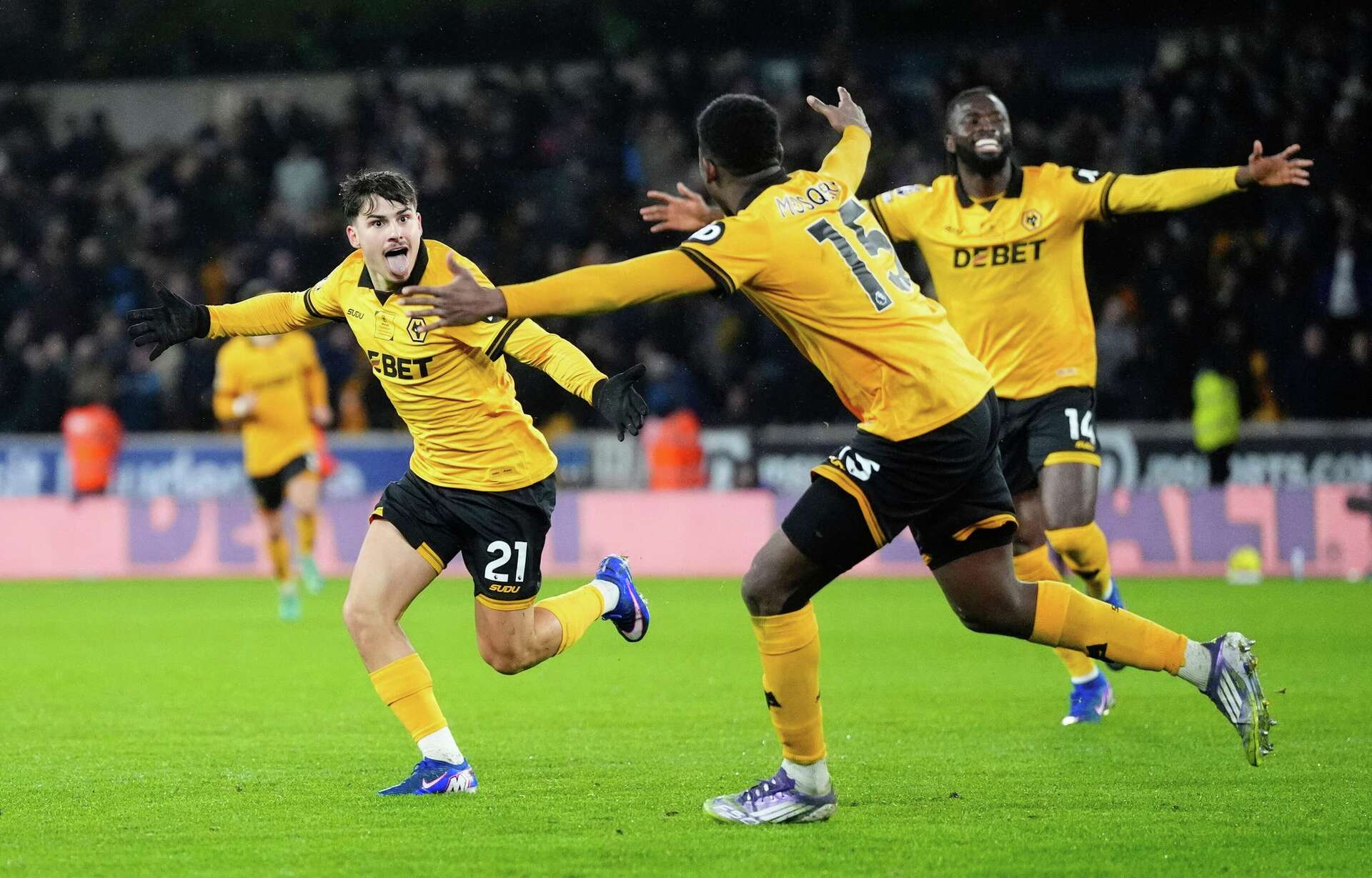 Wolves players explode in celebration after the second goal, with João Gomes (left) and teammates roaring in front of the ecstatic home crowd.